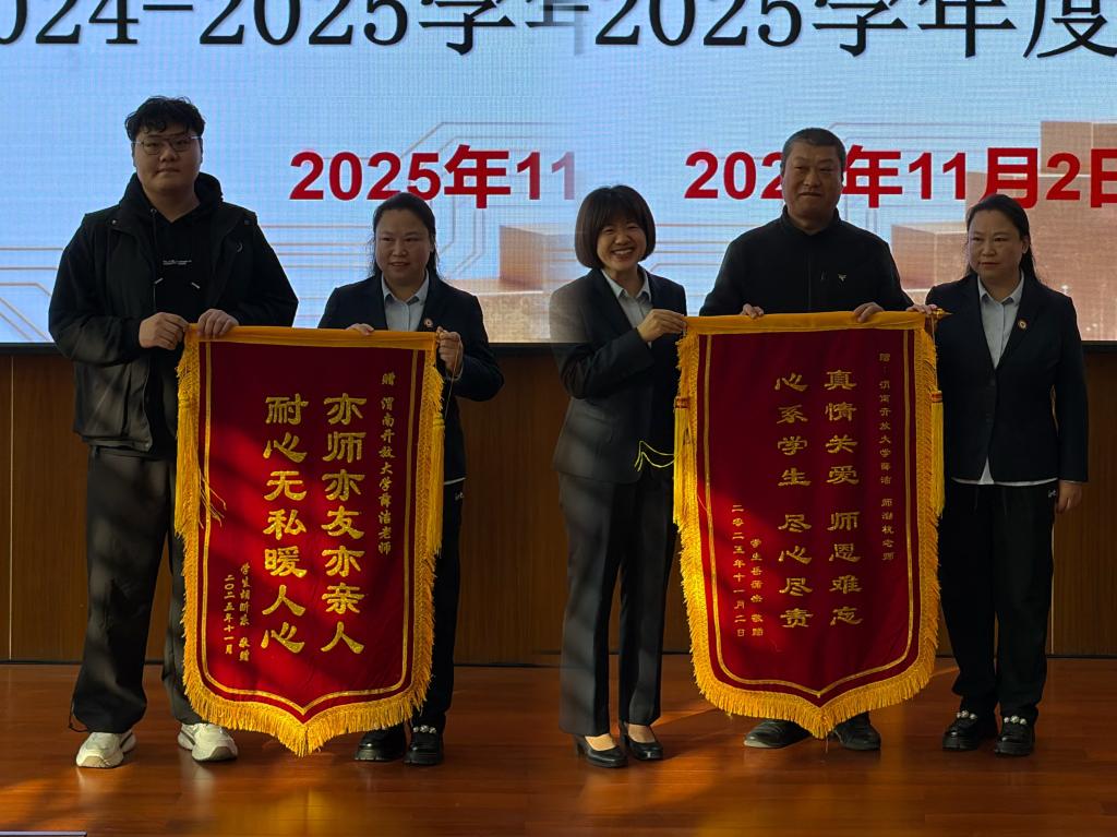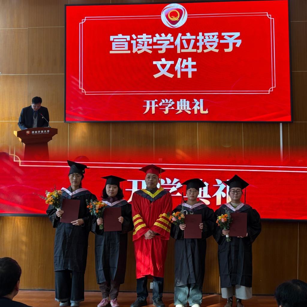 副书记张晓阳宣读了2025年《国家开放大学关于授予5765名本科毕业生学位的决定》,副校长张瑞华向获得学士学位的5位本科毕业生颁发了学位证书。副校长李斌宣读了《渭南开放大学2024-2025学年度获奖学生名单》,工会主席吴华新等为获奖学生发放证书、礼品和奖金。2名学员深感师恩向班主任教师、论文指导教师赠送了锦旗,热烈的掌声将开学典礼推向高潮。